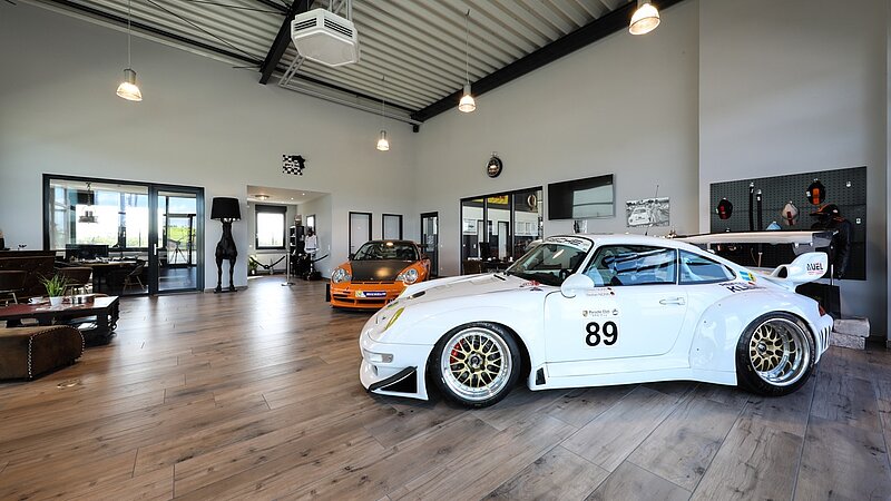 - Mechanische Werkstatt als Boxenlösung, mit Zentralzufahrt oder als hybride Lösung, mit spezifischer Hebebühnentechnik in Kooperation mit Werkstattausrüster, Montageplätze, Räderwechsel mit Platz für zugehörige Geräte und Flächen für Werkbänke, ausgebaute Teile, Maschinen und Geräte