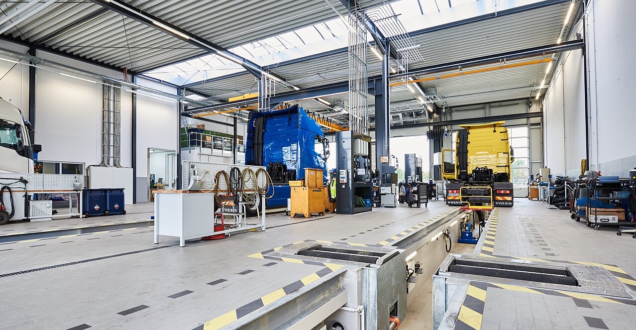 In der Werkstatt stehen drei Fahrspuren, davon zwei mit Grube, für Reparaturen zur Verfügung. Hebebühnen waren aufgrund der vorgegebenen maximalen Bauhöhe nicht umsetzbar, hatten aber auch keine Priorität. „Gruben sind immer noch die beste Lösung im Lkw-Bereich. Darin befinden sich frei verfahrbare Achsheber, die bei Nichtgebrauch platzsparend „geparkt“ werden können“, erklärt Rico Kleinpeter. Da Volvo auch gasbetriebene Trucks im Einsatz hat, wurde ein spezieller Arbeitsplatz mit Absaugung und sensorgesteuerter Dachluke eingerichtet. Eine Waschhalle und ein Aufbereitungsplatz für Neufahrzeuge schließt sich an die Werkstattspuren an.