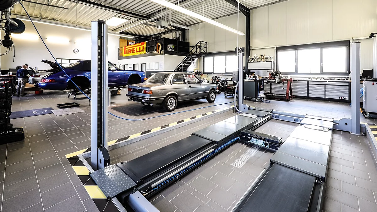 - Mechanische Werkstatt als Boxenlösung, mit Zentralzufahrt oder als hybride Lösung, mit spezifischer Hebebühnentechnik in Kooperation mit Werkstattausrüster, Montageplätze, Räderwechsel mit Platz für zugehörige Geräte und Flächen für Werkbänke, ausgebaute Teile, Maschinen und Geräte