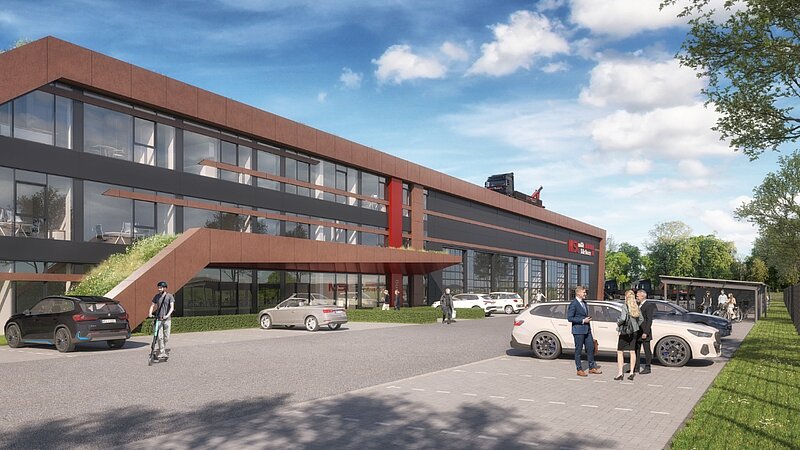 Mit rund 4.300 m² Gesamtfläche und einer Gebäudelänge von etwa 120 Metern entsteht ein dreigeschossiger Komplex, der Funktionalität und architektonischen Anspruch verbindet. Neben großzügigen Büroflächen umfasst das Projekt unter anderem eine Lkw-Werkstatt mit Prüfspur, Schweißhalle sowie moderne Sozialbereiche und attraktive Aufenthaltszonen wie Dachterrassen und eine Cafeteria.
