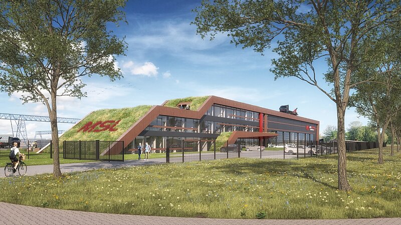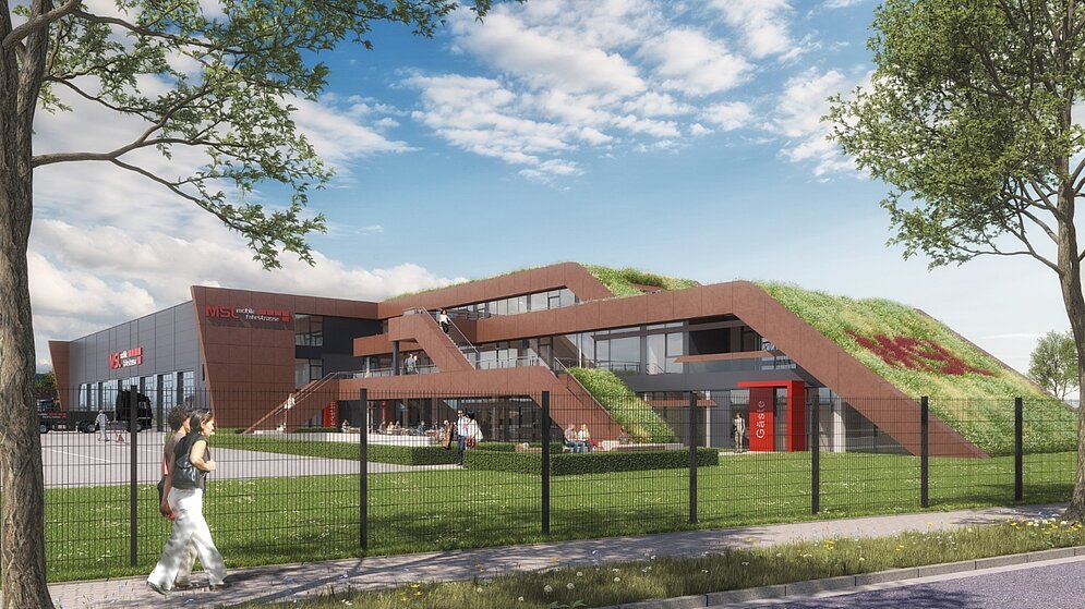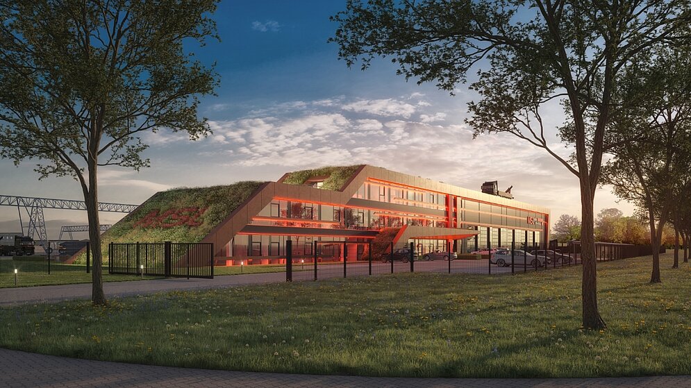 Auch gestalterisch setzt das Gebäude Akzente: Großzügige Glasflächen und eine Fassade in Stahl-Optik greifen die Kernkompetenz des Unternehmens auf und verleihen dem Neubau eine markante Identität. Ein begrüntes Dach sowie besondere architektonische Elemente machen das Objekt zusätzlich zu einem echten Blickfang. Abends wird das Gebäude farbig beleuchtet und sorgt so für zusätzliche Aufmerksamkeit.