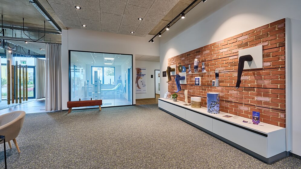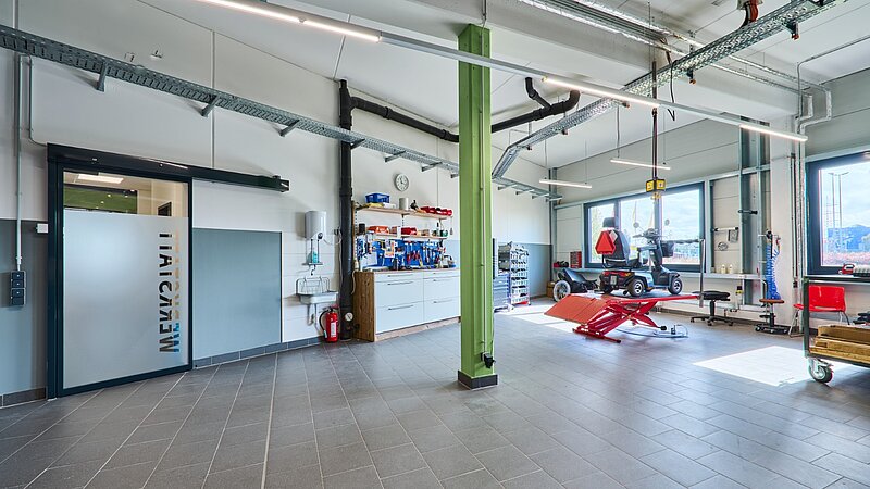 Denn auch die Belegschaft soll sich in dem neuen Sanitätshaus wohlfühlen und wurde deswegen auch in Entscheidungsprozesse mit einbezogen. Die Gestaltung des Neubaus fördert Kommunikation und Austausch unter den Mitarbeitenden – unter anderem durch einen großen Pausenraum mit Kicker, Küche und Dachterrasse, der außerdem auch für interne und externe Schulungen genutzt werden kann. Flexibilität bietet der Neubau auch insofern, dass er Potential für mögliche spätere Geschäftserweiterungen bietet.