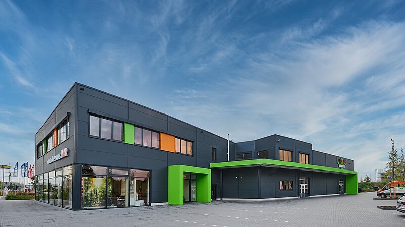 Visuell prägen Großzügigkeit, Transparenz und fließende Übergänge die Ladenfläche des Neubaus, Sichtschutze verschiedenster Art sorgen für die nötige Diskretion. Die Außenfront lenkt mit den Firmenfarben Grün und Orange die Aufmerksamkeit von Vorbeifahrenden auf sich – mit Erfolg: 60 bis 70 Kunden begrüßte das H&R-Team bereits kurz nach Eröffnung pro Tag im neuen Laden.