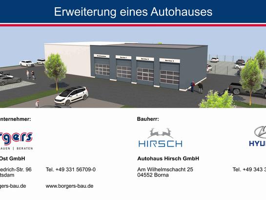Für unseren langjährigen Kunden Autohaus Hirsch dürfen wir die Erweiterung des Hyundai Autohauses in Borna realisieren. Geplant ist eine neue Werkstattfläche mit rund 240 m², die nicht nur funktional, sondern auch zukunftsorientiert ausgerichtet ist: Der Schwerpunkt liegt auf E-Mobilität und der Wartung von Elektrofahrzeugen.