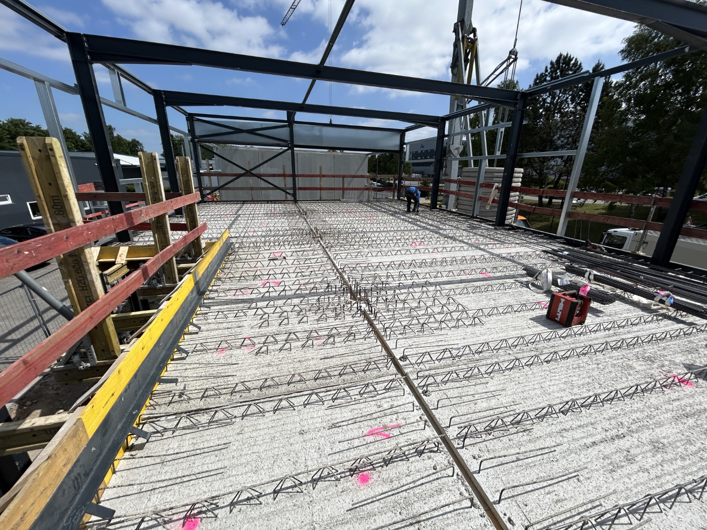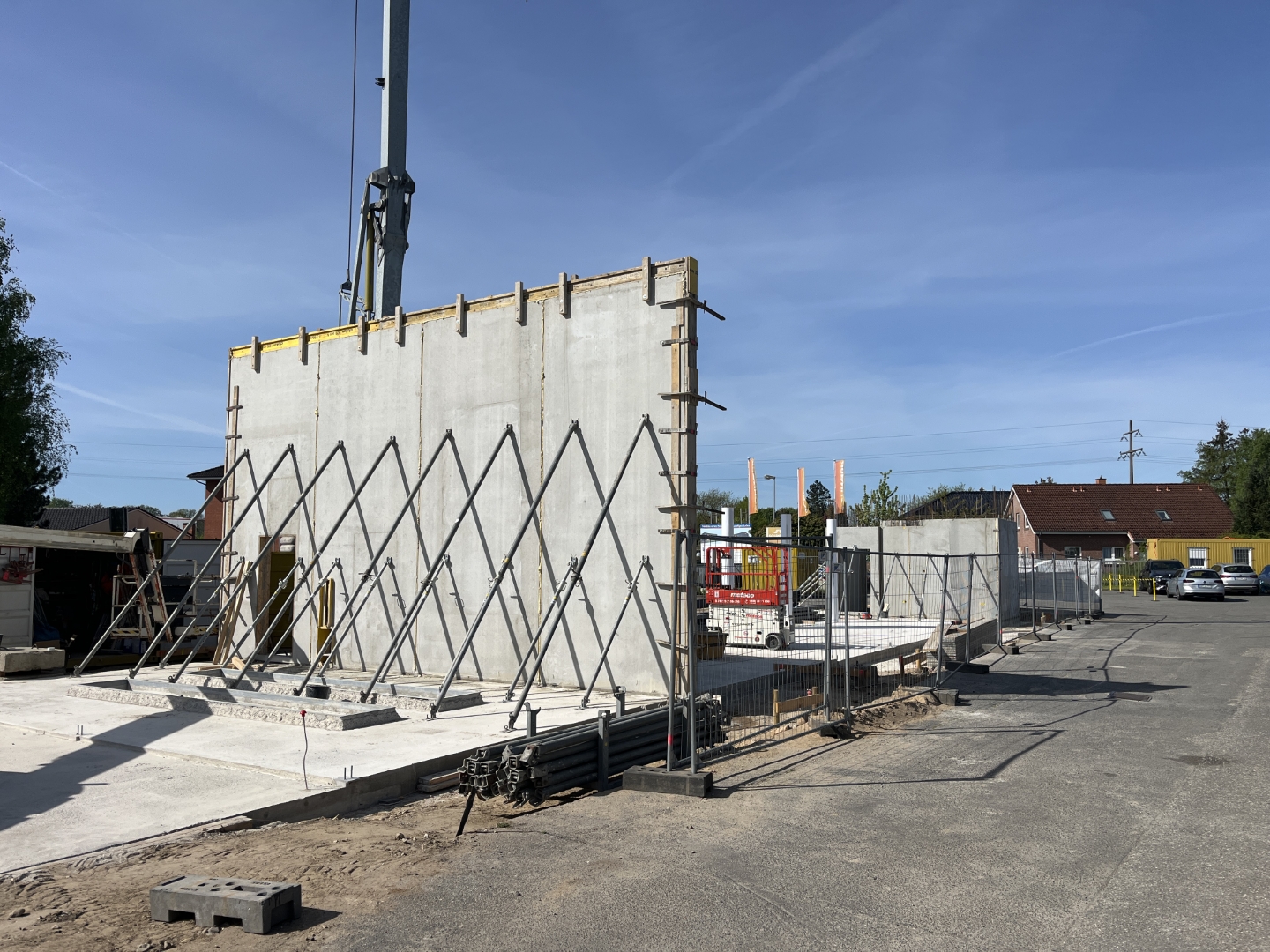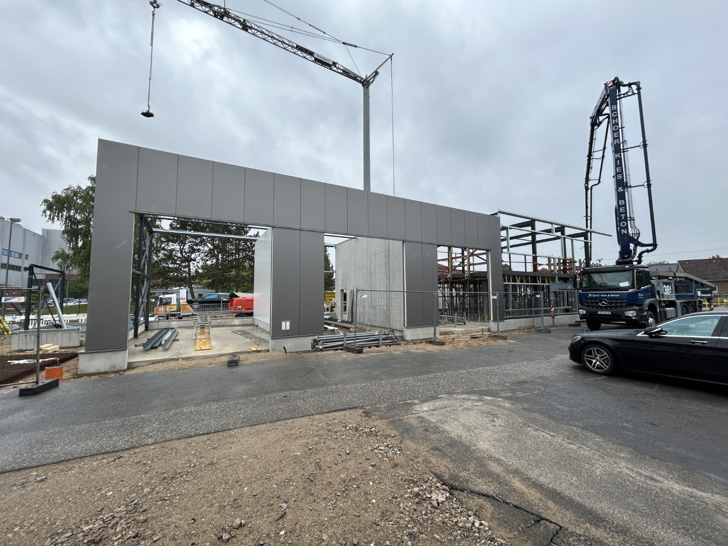 Auf einer Gesamtfläche von rund 547 m² entsteht nun ein durchdachtes Gebäude mit zweigeschossiger Verwaltung, großzügigen Büroflächen, einem einladenden Empfangsbereich mit Serviceannahme, einer Kundenlounge sowie modernen Bereichen für Dialogannahme, Smart-Repair und Fahrzeugwäsche. Die Waschanlage wird für den späteren Einbau einer Portalwaschanlage vorbereitet – zunächst kommt eine Hochdruckreinigung mit professioneller Wasseraufbereitung zum Einsatz.