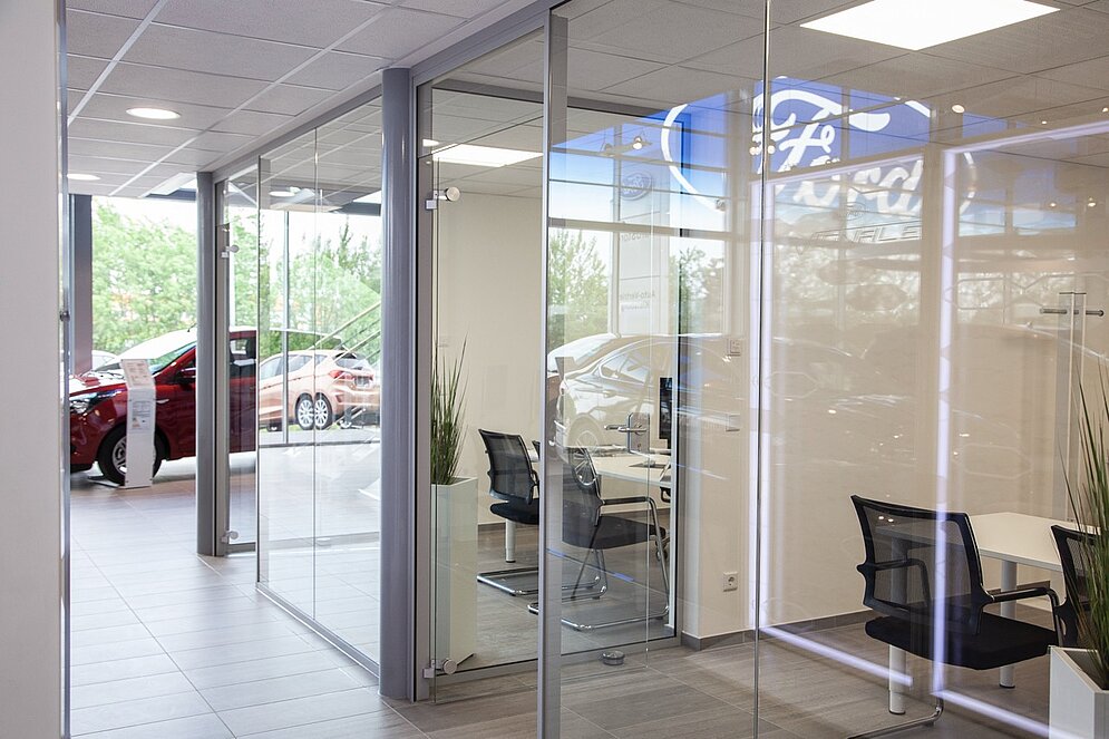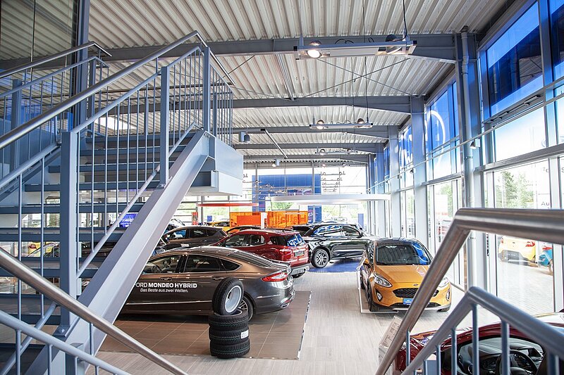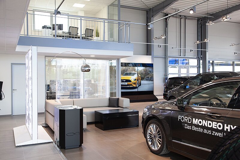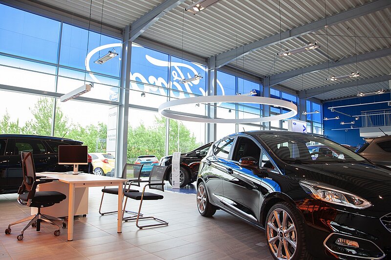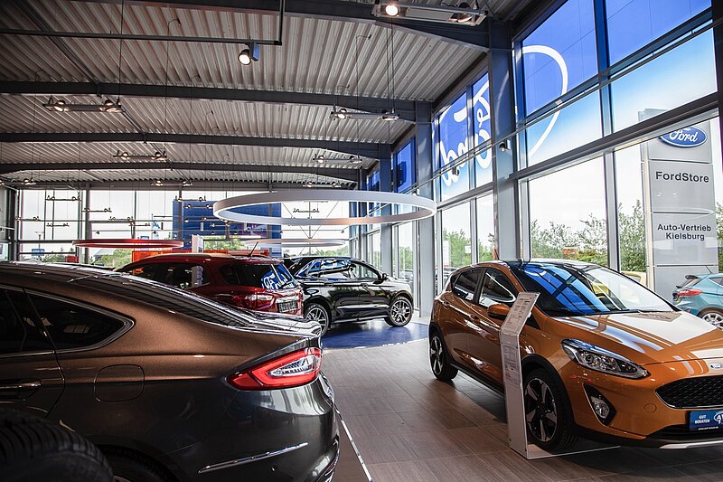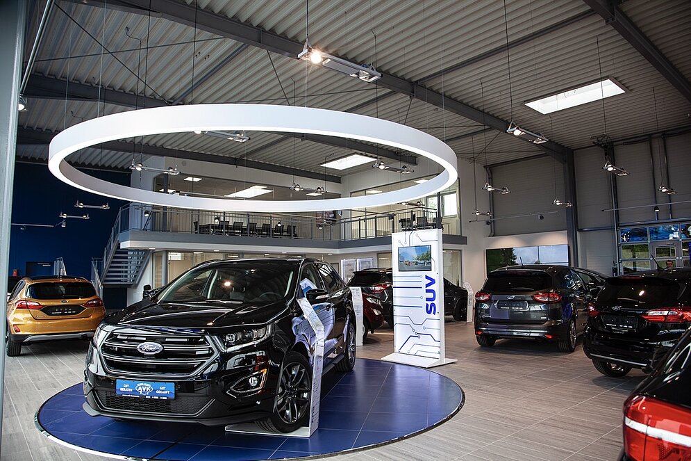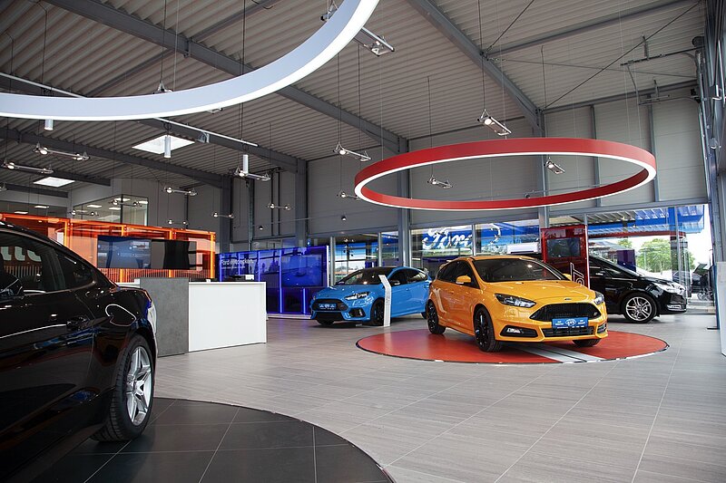 Für das Autohaus AVK in Husum durften wir bereits zwei Projekte erfolgreich umsetzen. Im Rahmen einer umfassenden Revitalisierung entstand ein moderner Anbau mit rund 780 m² Nutzfläche - ein wahrer „Ford-Leuchtturm an der See“. Die neue, lichtdurchflutete Ausstellungsfläche bietet Raum für die Neuwagenübergabe, großzügige Verkäuferarbeitsplätze sowie eine zusätzliche Galerieebene. So präsentiert sich das Autohaus heute als „nördlichster FordStore Deutschlands“. Die besondere Energieeffizienz – gefördert durch KfW-Zuschüsse – wird unter anderem durch die Kombination aus Wärmepumpe und Photovoltaik-Anlage erzielt.