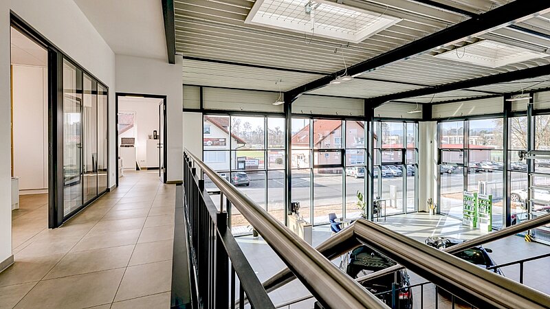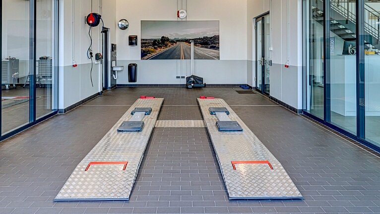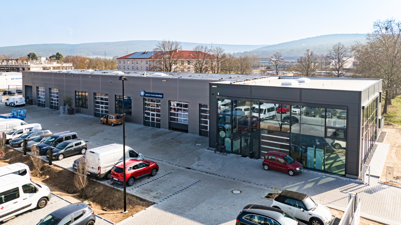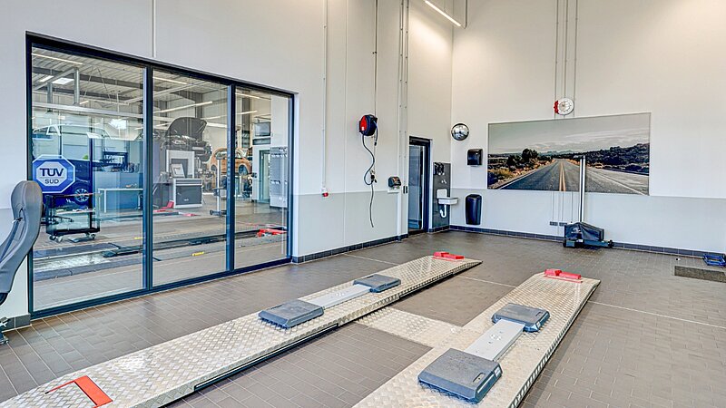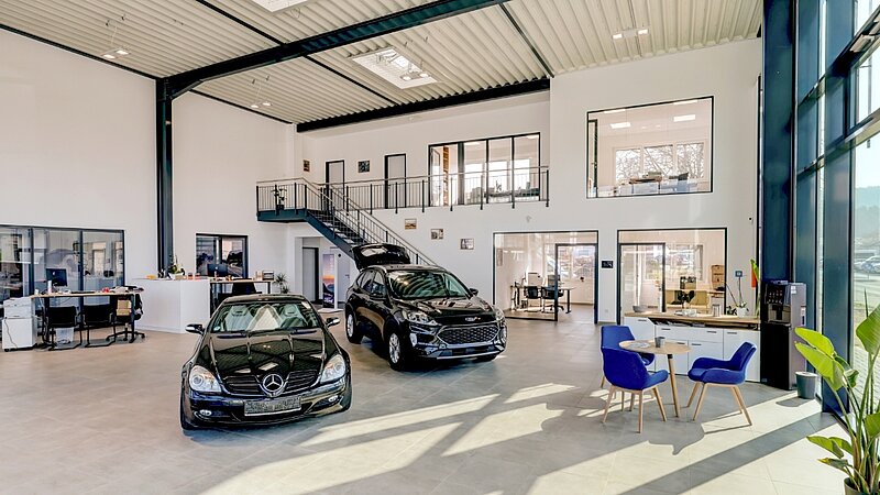 Auf rund 1.345 m² Gesamtfläche ist ein zukunftsorientierter Standort entstanden, der dem stetigen Wachstum des Unternehmens gerecht wird. Das 19-köpfige Team findet hier klar strukturierte Funktionsbereiche mit kurzen Wegen vor: 12 moderne Werkstattarbeitsplätze für Pkw und Nutzfahrzeuge, eine Dialogannahme, ein hochmoderner FAS-Raum für Achsmessung und Kalibrierung, ein Prüfraum für HU/AU sowie ein Wasch- und Pflegebereich mit Portalwaschanlage. Ergänzt wird das Konzept durch eine großzügige Ausstellungsfläche mit Showroom-Charakter, die Raum für Beratung und Fahrzeugpräsentation bietet. Im Obergeschoss sind weitere Büro- und Sozialräume sowie Lagerflächen entstanden.
