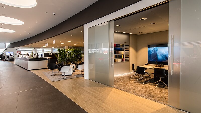 Außenansicht eines modernen Autohauses mit Verkaufsbereich und vielen E-Autos auf dem Gelände