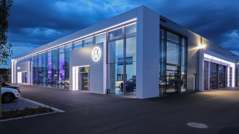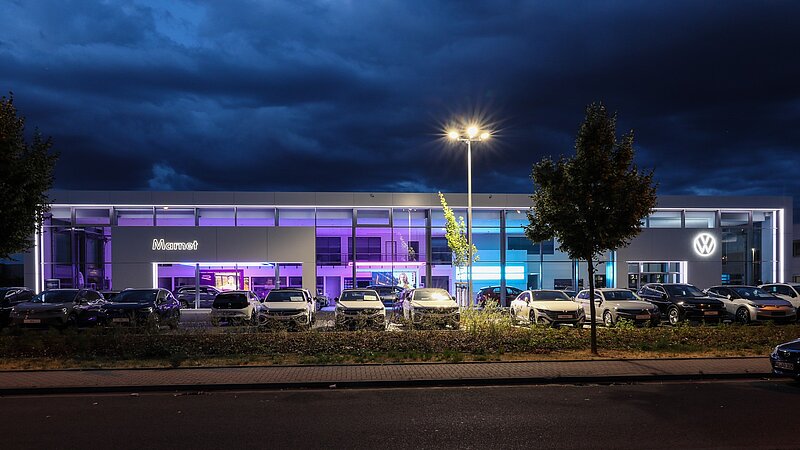 2023 durften wir erneut für die Marnet-Gruppe bauen: In Wiesbaden haben wir den Neubau eines VW-Autohauses mit einer Gesamtgröße von über 4.100m² realisiert. Neben einer 576m² großen Ausstellung sind Flächen für die Bereiche Werkstatt, Karosserie, Dialogannahme, FAS/Prüfung, Aufbereitung, Lager, Verwaltung, Verkauf, Fahrzeugwäsche, Technik, Sozialräume sowie ein ca. 360m² großer Gebrauchtwagenpavillon entstanden.
