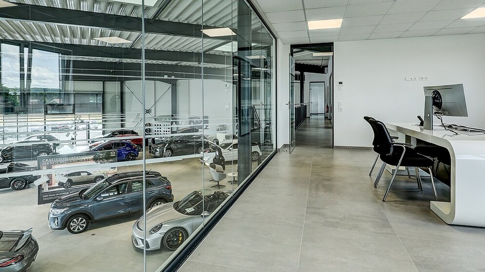 Neben einer großzügigen Ausstellungsfläche umfasst das ca. 1.490m² große Gebäude die Bereiche Werkstatt, Direktannahme, Nachtanlieferung, Aufbereitung, Fahrzeugwäsche, Lager, Technik sowie Büro- und Sozialräume.