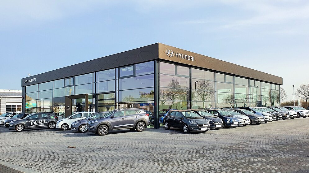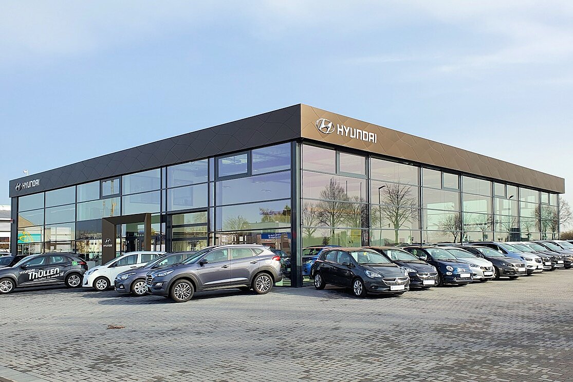 Für das Autohaus Thüllen, das inzwischen an sechs Standorten Autos der Marke Hyundai vermarktet, durften wir in Kempen ein ca. 1.060 m² großes Hyundai-Autohaus mit Ausstellungsfläche, Werkstatt, Reifenhotel, Büro- und Sozialräumen bauen.