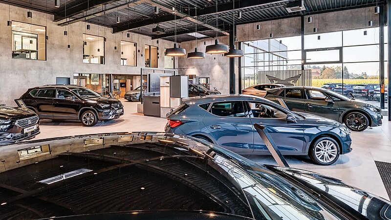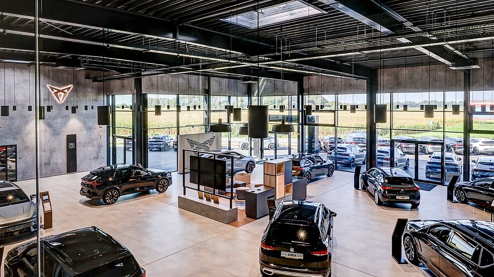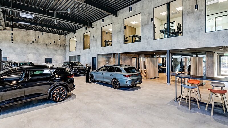 Das Gebäude wurde nach dem neuesten Hersteller-CI-Standard realisiert und folgt dem aktuellen Corporate Identity Konzept der Marken SEAT und CUPRA. Ziel war eine attraktive, ausgewogene Präsentation beider Marken sowie ein Kundenbereich, der ein maximales Markenerlebnis schafft und die Verbundenheit der Marken optimal unterstreicht.