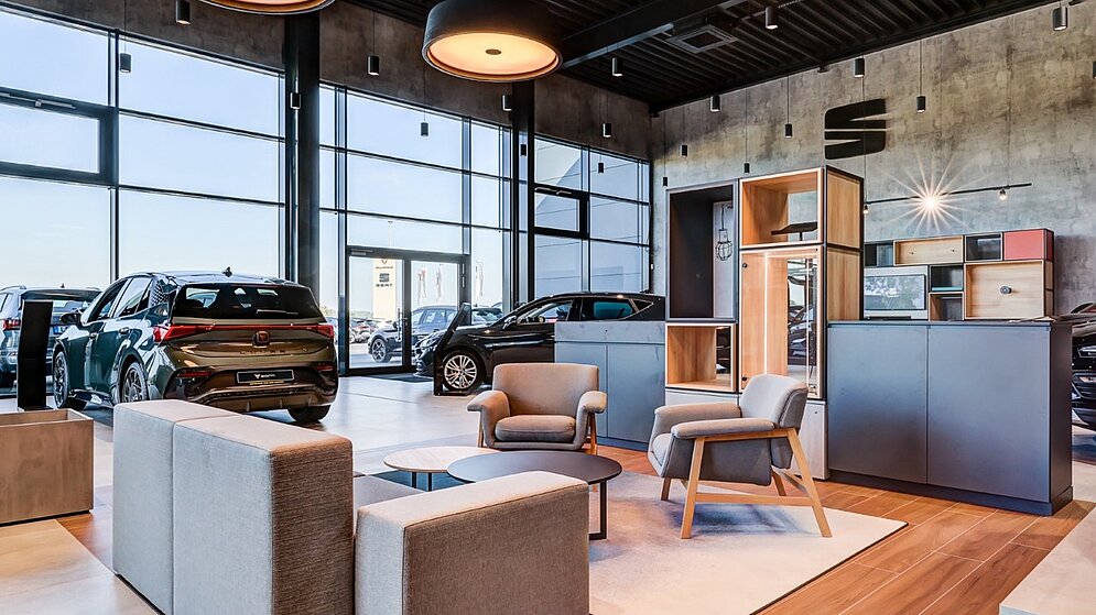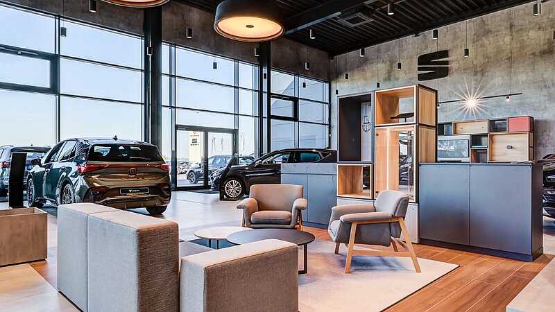 - SEAT Showroom und CUPRA Showroom mit markenspezifischen Elementen wie SEAT wall, CUPRA wall, CUPRA wooden wall sowie dem Merchandisingsortiment beider Marken