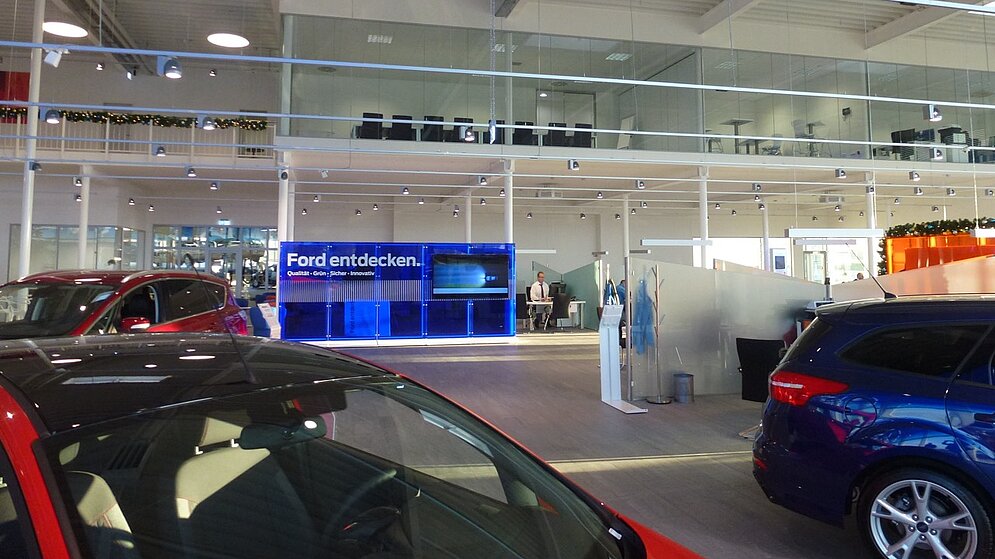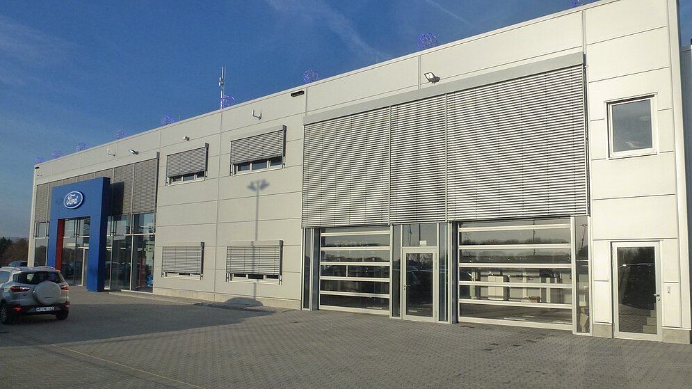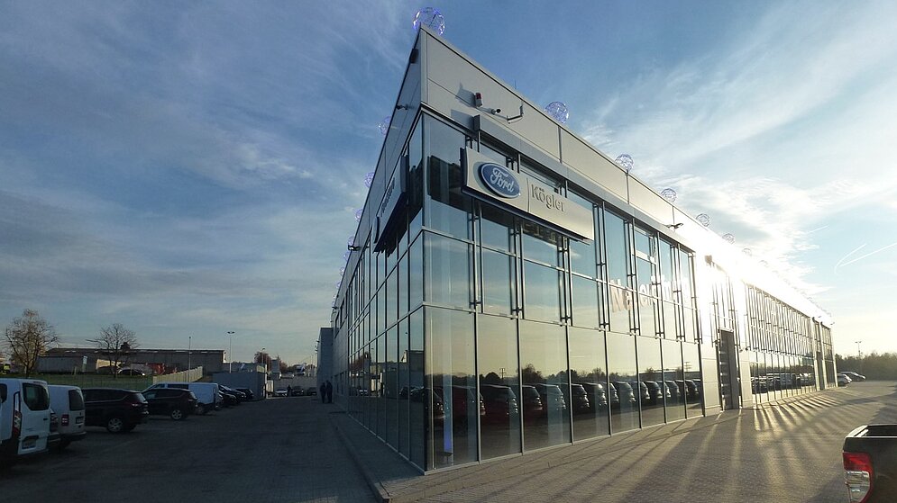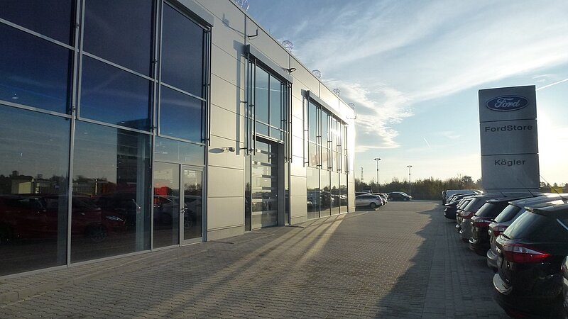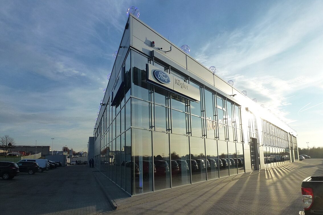 Das Autohaus Kögler wirbt als „Deutschlands größte Ford-Ausstellung“ mit „2000 Ford auf Lager“. Als Generalunternehmen haben wir das Autohaus mit ca. 2.000 qm Ausstellung, 700 qm Galerie mit Büros und 1.200 qm Werkstatt schlüsselfertig und zum Festpreis gebaut. Auch die Außenanlagen von der Entwässerung bis zur Hofbefestigung gehörten zu unserem „Komplettpaket“.