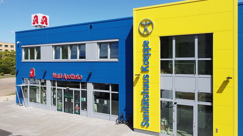 In Eberswalde haben wir ein ca. 2.300 m² großes Sanitäts- und Ärztehaus mit Apotheke, Orthopädie-Werkstatt, sonstigen Therapie- und Beratungsbereichen, Verwaltungs- und Sozialräumen, Lager etc. realisiert. Das Projekt wurde zugeschnitten auf die spezifischen Anforderungen des Bauherrn in Bezug auf ein eigens entwickeltes integrales Kompetenz-Konzept. Auch die äußere Gestaltung spiegelt das "Corperate Design" des Gesundheitsunternehmens Koeppe in Eberswalde wieder. Dies ist - wie wir finden - ein zukunftsfähiges Gesundheitszentrum.