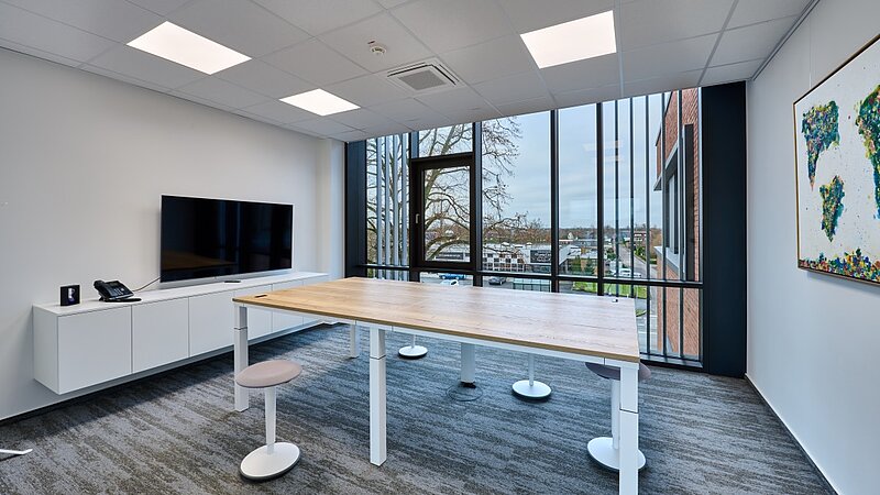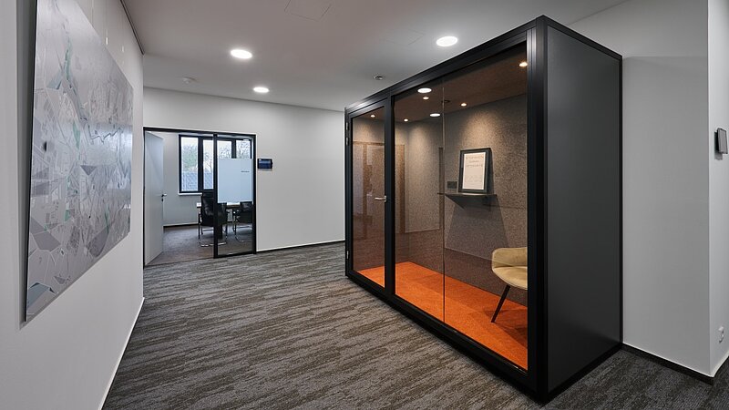 Auf ca. 2.500 m² bietet das neue Gebäude Kapazitäten für 85 Arbeitsplätze und lässt mit Besprechungsräumen, Meetingzonen, einem Pausen- und Multifunktionsraum (z. B. für Massagen), einer Kantine und mehreren Küchennischen keine Wünsche offen. Unser maßgeschneidertes Konzept für die individuellen Ansprüche der Steuerberatung zeigt sich u. a. in einem Sichtschutz an den Außenwänden der Besprechungsräume, die dem Team ungestörte Mandanten-Gespräche ermöglichen.