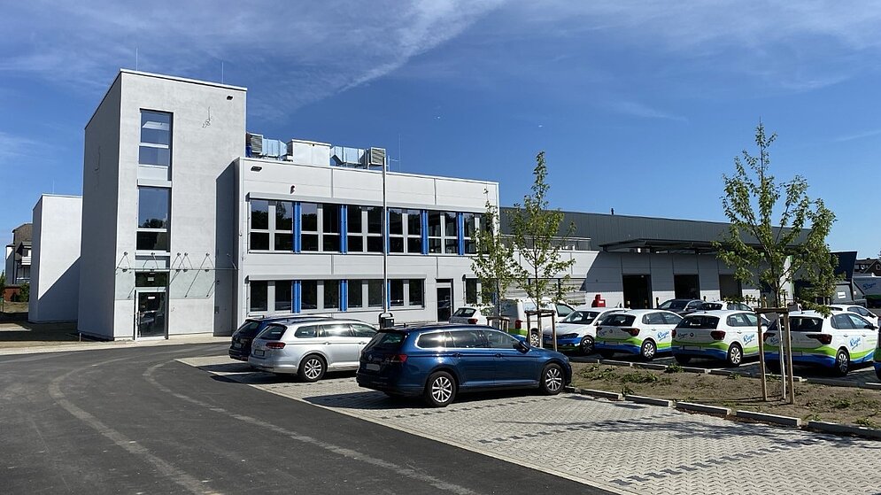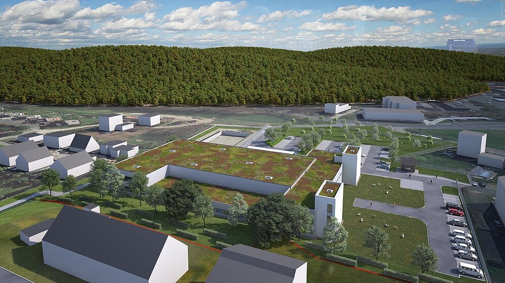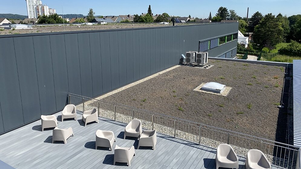 Das Gebäude wurde besonders energieeffizient geplant und gebaut. Die Erfüllung hoher Dämmstandards bei der Außenhülle ist dabei selbstverständlich, hinzu kommt der Einsatz moderner Gebäudetechnik, zum Beispiel erfolgt die Beheizung über eine energieeffiziente Wärmepumpe. Auf dem gesamten Gebäudekomplex befindet sich ein Gründach, das auch für die eventuell spätere Installation einer PV Anlage ausgelegt.