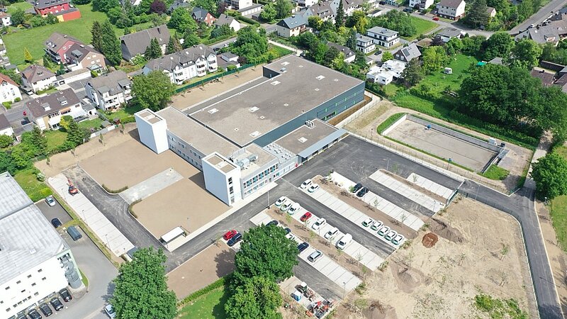Wir waren auch mit der Erstellung der Außenanlagen beauftragt, neben einer Stellplatzanlage mit einer Größe von ca. 5.300m² wurden umfangreiche Grünflächen mit einer Größe von ca. 7.250m² angelegt, die ebenfalls zum nachhaltigen Baukonzept passen. Es werden Bäume, Sträucher, Wildwiesen angelegt, sodass dort später Schafe weiden können. Die zum angrenzenden Wohngebiet befindlichen Bestandsbäume blieben erhalten. Der Gebäudekomplex fügt sich so in die bestehende Landschaftsarchitektur ein.