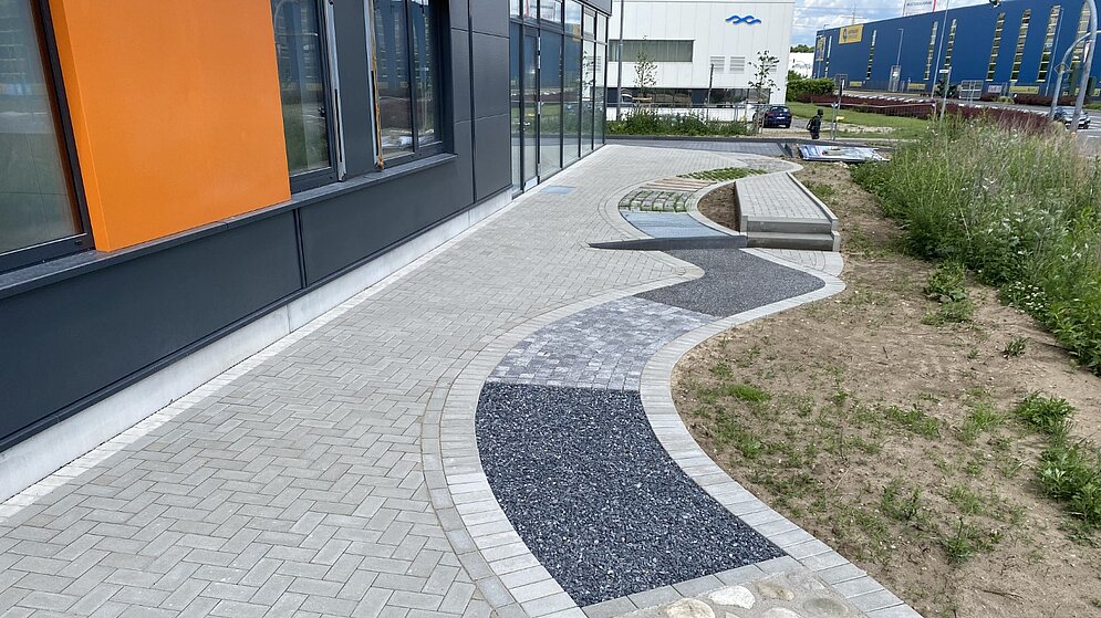Das zweigeschossige Gebäude wurde von uns besonders energieeffizient geplant und gebaut und erfüllt die Kriterien für ein KfW-55 Effizienzhaus. Das bedeutet, dass nur etwa die Hälfte der Energie eines modernen Neubaus verbraucht wird. Neben hohen Dämmstandards kommt hier moderne Gebäudetechnik zum Einsatz – von LED-Beleuchtung bis zur Luft-Luft-Wärmepumpenanlage. Eine Photovoltaik-Anlage liefert den selbsterzeugten Strom. Auch die kompletten Außenanlagen mit einer befestigten Fläche von ca. 2.500m² und Grünflächen mit ca. 3.000m² realisierten wir für Kaarst – inklusive E-Ladestationen für Fahrräder und PKW. Die Niederschlagsentwässerung erfolgt unter Berücksichtigung ökologischer Aspekte auf dem Grundstück über Mulden, Rigolen und Rasengittersteine.