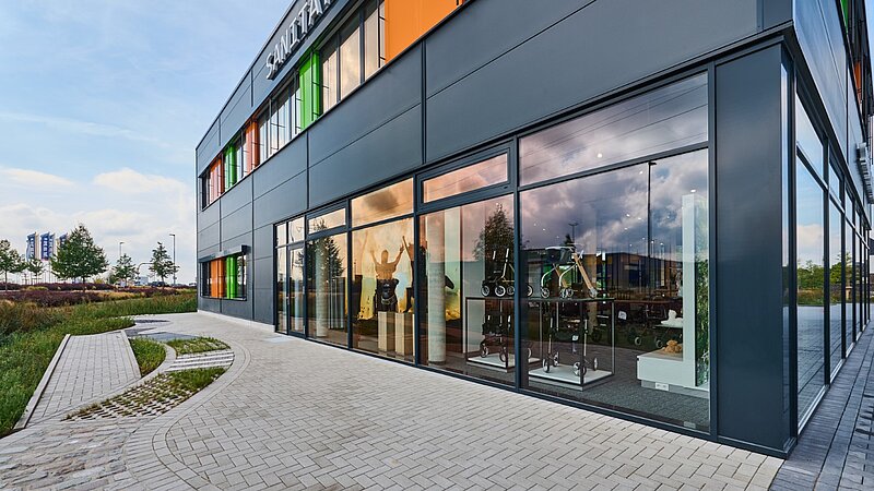 Denn auch die Belegschaft soll sich in dem neuen Sanitätshaus wohlfühlen und wurde deswegen auch in Entscheidungsprozesse mit einbezogen. Die Gestaltung des Neubaus fördert Kommunikation und Austausch unter den Mitarbeitenden – unter anderem durch einen großen Pausenraum mit Kicker, Küche und Dachterrasse, der außerdem auch für interne und externe Schulungen genutzt werden kann. Flexibilität bietet der Neubau auch insofern, dass er Potential für mögliche spätere Geschäftserweiterungen bietet.