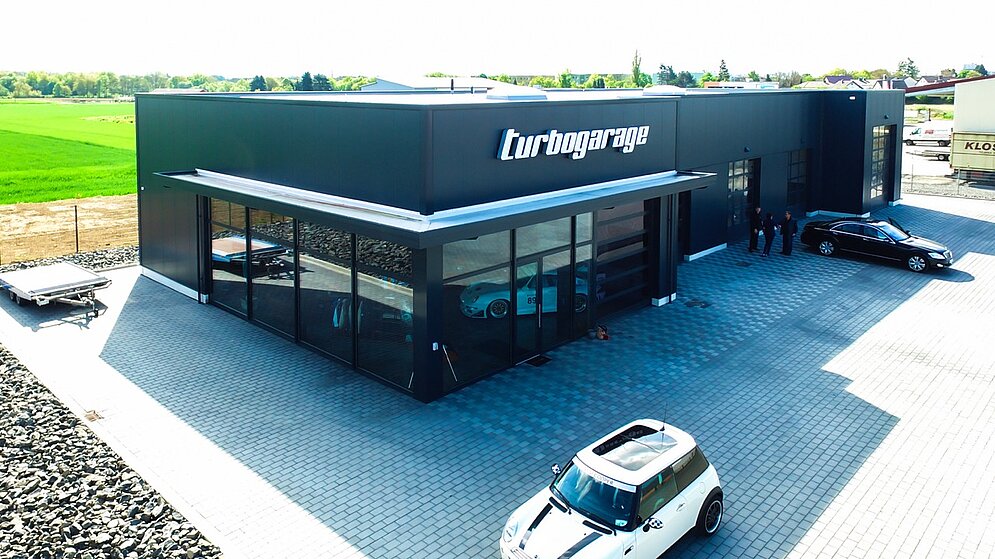 Nach Erteilung der Baugenehmigung begann der Baustart im April 2016. Nur sechs Monate später wurde die Turbogarage schlüsselfertig übergeben. Auf einem rund 2.500 m² großen Grundstück entstand ein architektonisch ansprechendes und zugleich hochfunktionales Gebäude mit circa 600 m² Nutzfläche. Diese verteilen sich auf moderne Werkstattarbeitsplätze, einen großzügigen Showroom sowie Lager- und Personalräume.
