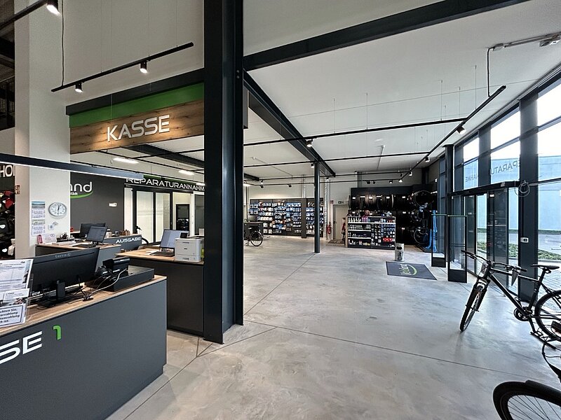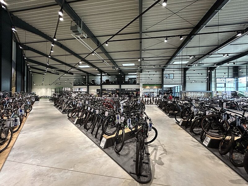 Das neue Fahrradhaus umfasst eine große Ausstellung- und Verkaufshalle, in der die neuesten Fahrradmodelle präsentiert werden. Zudem gibt es eine topmoderne Werkstatt, die für alle Service- und Reparaturarbeiten bestens ausgestattet ist. Ergänzt wird das Gebäude durch Sozialräume mit Galerie, eine Direktannahme für Kunden, einen Bürotrakt sowie umfangreiche Lagerflächen.